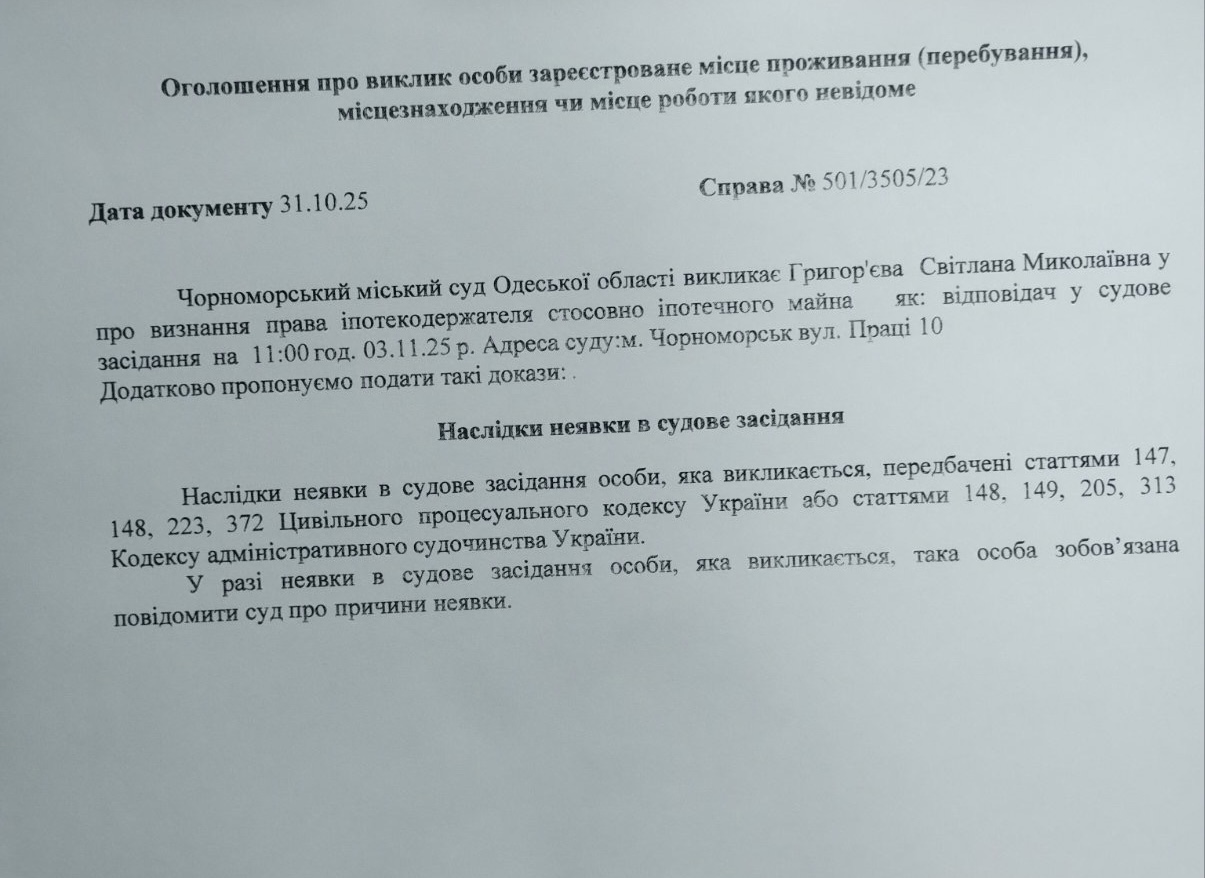 Оголошення про виклик особи місце проживання , місцезнаходження якого невідоме
