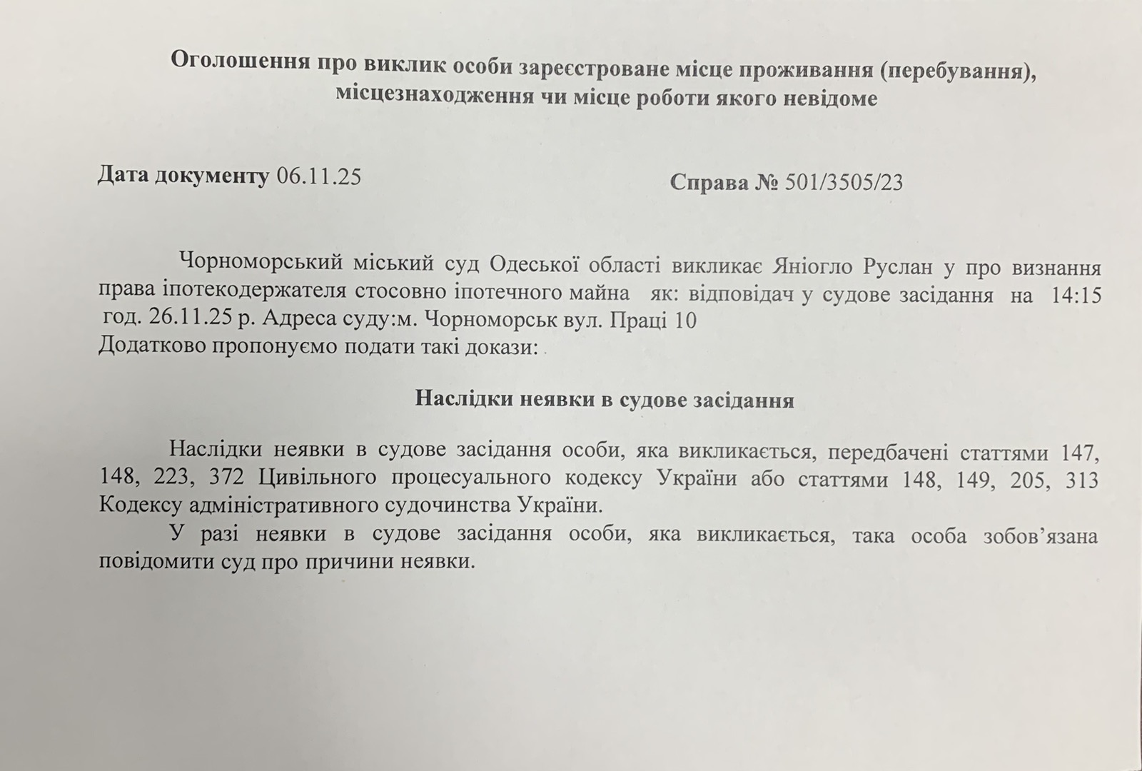 Оголошення про виклик особи місце проживання , місцезнаходження якого невідоме
